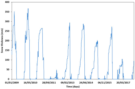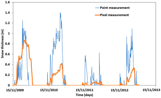 37]. The thin line represents the point measurements of the changing thickness of snow over a four-year period at a point located in the Refugio de Poqueira (Sierra Nevada). The thick line represents the pixel measurements of snow from the dataset used in the work presented here and the previous simple model. The changing thickness results are similar but not identical because of the different supports (point and pixel) on which they are measured.