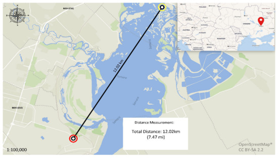 A map of the sampling site. The yellow circle indicates the sample sites; the red circle indicates the enterprise location; the dark line is drawn at a distance of 12,020 m from the source of pollution (enterprise for the production and processing of batteries in Dnipro city in Ukraine) to the sample site. The insert map is a map of Ukraine. The red symbol indicates the city of Dnipro. “CC BY-SA 2.2”.