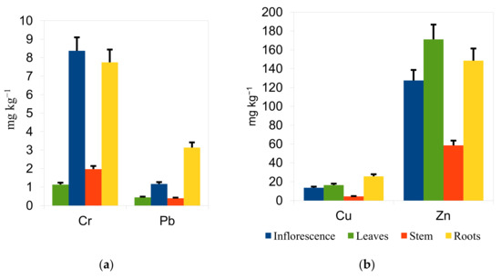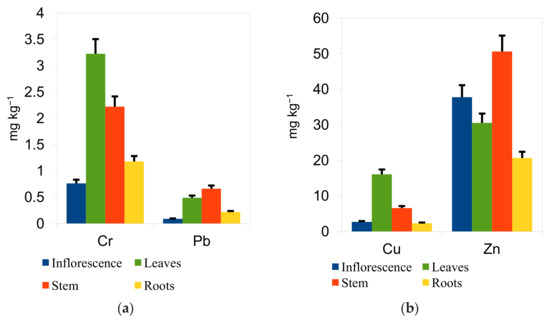 The concentration of Cr and Pb (a) and Cu and Zn (b) in parts of Ambrosia artemisiifolia L.