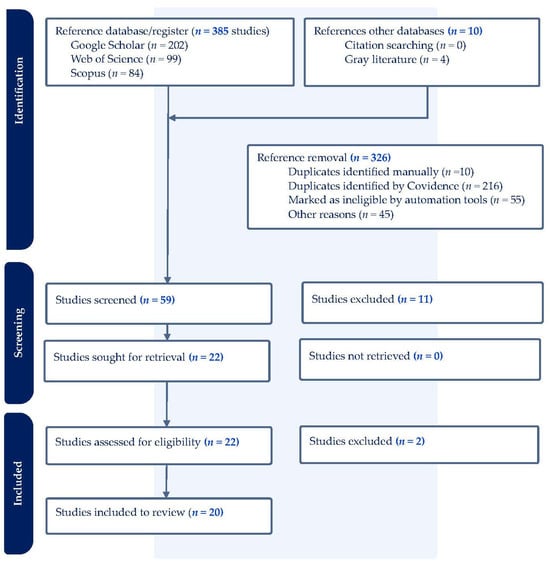 We conducted a systematic literature review to address the research questions of this study and test the established hypotheses. The review was performed using academic databases including Scopus, Web of Science, Portal Periódicos Capes (Brazil), and Google Scholar, as well as the Rayan, Parsifal, and Covidence applications []. The review protocol was structured based on the P.I.C.O. concept (Population, Intervention, Comparison, Outcome), following the guidelines outlined in the PRISMA statement []. Figure 3 illustrates the PRISMA flowchart outlining the review process.