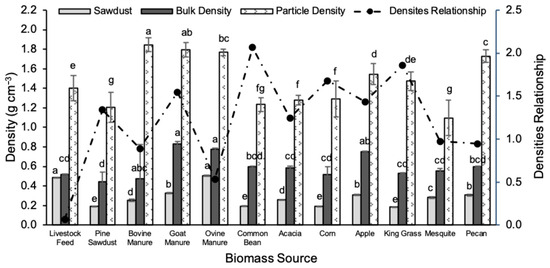 Bovine, caprine, and ovine manure pellets exhibited the highest particle density, with levels between 1.76 and 1.84 g cm−3. On the other hand, significantly lower values were found in mesquite (1.09 g cm−3) and pine pellets (1.20 g cm−3). Lower particle density is due to the use of biomass from branches and secondary twigs in the case of mesquite and sawdust from multiple pine individuals, as well as the inclusion of bark remnants showing low density. Lignification, fiber breakdown, bark, tracheid, and vessel elements reduced the wood densification capacity in mesquite and pine. In previous studies, the density of organic materials from different plant species decreased as the vessel diameter and cell wall thickness were modified [16].