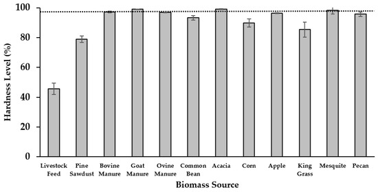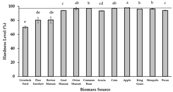 The hardness of the briquettes showed significant (p ≤ 0.05) differences among the biomass sources evaluated (Table 4). Briquettes made from caprine manure and mesquite had higher hardness levels, both with 99.1% of the requirement established for this type of product on EN 14961-2, 2012 [19]. Other organic materials that resulted in briquettes with high levels of hardness were mesquite (98.1%), bovine manure (97.1%), and ovine manure (96.9%). Pecan and apple tree biomass generated briquettes with acceptable hardness in the 95.7% to 97.1% range. On the contrary, briquettes made from livestock feed exhibited the lowest hardness level, reaching a percentage of 45.6% compared to the recommended level. Lower briquette hardness reinforces the need to include additives, such as molasses, in this helpful input for animal feeding to achieve greater cohesion between particles (Figure 5).