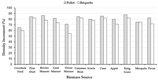 Increase in density due to the effect of two densification treatments of the original biomass of organic materials collected in México. (Change the letter type in the Graphic, Y axis).