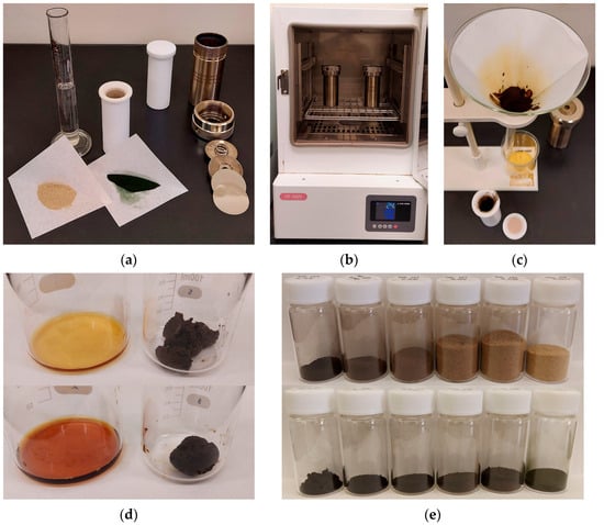 The HTC experiment was performed in a 45 mL synthesis vessel (Model 4744, Parr Instrument Co., Moline, IL, USA) and thermally induced in a laboratory oven (see Figure 2b). A mixture of biomass and deionized water was loaded at a ratio of 1:10 (3.5 g of dried biomass and 35 g of water) (see Figure 2a). Four factorial points of temperature (175 °C and 225 °C) and residence time (1.25 and 2.75 h) were set as the operating parameters, following our previous research design []. An additional point of 250 °C for 2.75 h was added to represent the most severe HTC condition (see Table 1). After the HTC process, the vessel was removed and cooled to 27 °C using a fan. The solid phase was then separated from the aqueous phase by gravity filtration of the obtained slurry (see Figure 2c,d). The residual solids were dried at 105 °C for 24 h to recover the hydrochar. Three samples were prepared for each analysis to ensure reproducibility. Ground SB and MA biomasses and hydrochars are shown in Figure 2e. The hydrochars produced were labeled by their severity factor (SF). SF represents the integration of temperature, T (in °C), and residence time, t (in min) []. It is expressed as shown in Equation (1), where RO is the ordinate reaction defined by Overend et al. [] to describe the impact of steam-aqueous pretreatment on biomass fractionation.