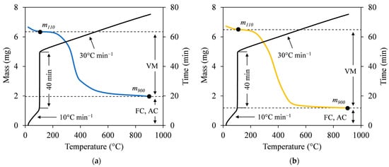The proximate analysis provides the portion of the sample that burns in the gaseous (volatile matter; VM) and solid states (fixed carbon; FC), as well as the unburned inorganic residue (ash content; AC). Following the two-step heating method described by Czajka [], the VM was determined using a thermal analyzer (EXSTAR 6000 TG/DTA 6200, Seiko Instruments Inc., Chiba, Japan). Approximately 6–7 mg of a sample was heated under a flowing N2 gas at 200 mL min−1. The heating was set from ambient temperature to 110 °C at a rate of 10 °C min−1 and held for 40 min. The process continued at a heating rate of 30 °C min−1 until the temperature reached 900 °C without being held. Subsequently, the VM (in %) was calculated using Equation (5) by referring to Figure 3: