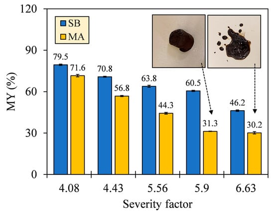 The number of recovered solids in hydrochars was observed to depend on the HTC severity (see Figure 4). As SF increased, the MY of SB hydrochars decreased from 79.5% to 46.2%, and that of MA decreased from 71.6% to 30.2%. The downward trends confirm hydrous degradation before char formation, which is driven by ionic reactions and low-viscosity penetration []. This is evidenced by the SEM images (see Appendix A, Figure A1), where the gradual destruction of the original biomass matrices occurred alongside the formation of irregular block-shaped (SB) and oil-like hydrocarbons (MA). However, the MA hydrochar between SFs 5.90 and 6.63 exhibited no observable decrease in MY with a deviation of 1.1%. The insets of Figure 4 reveal that the corresponding MA hydrochar underwent a phase transition by forming an emulsion due to high bio-oil production. The transition implies that the operating limit between hydrothermal carbonization (HTC) and liquefaction (HTL) was attained, and the bio-oil separation may require a solvent extraction, hence hindering solid production and making solid conversion uneconomical for HTC of MA beyond the SF 6.63.