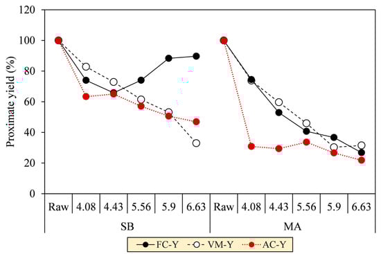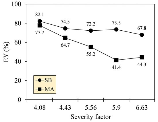 The quality of carbonization, determined by MY and HHV, surely demonstrates the applicability of a fuel to a combustor but at the expense of energy loss []. To consider the techno-commercial feasibility of SB and MA, the energy losses of their hydrochars were quantified by calculating EY. Figure 5 shows that the EY of SB hydrochar was higher than that of MA, and both trends were relatively decreasing as SF increased from 4.08 to 6.63. The EY of SB and MA hydrochars amounted to 82.1–67.8% and 77.7–44.3%, respectively. The higher EY of SB hydrochar indicates that the solids of SB retained more energy-rich components while losing some energy-lean components during HTC. Therefore, SB hydrochar is more promising for practical importance by balancing the heat output of a combustor (maximizing HHV generation) and the availability of feedstock (minimizing MY loss) [].