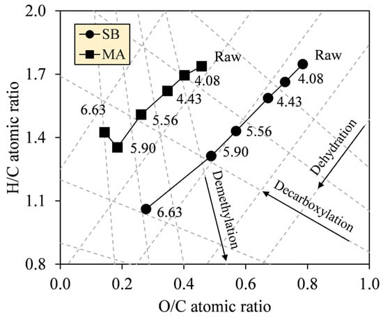 The formalism of the Van Krevelen diagram was proposed to grasp the atomic alteration in C, H, and O by the deoxygenation and demethylation reactions likely involved during HTC []. The diagrams in Figure 6 show intense decreases in O/C (0.78–0.28 (SB), 0.46–0.19 (MA)), and H/C ratios (1.75–1.06, 1.74–1.35) (see Table 2), indicating that dehydration dominated the other reactions. Noticeably, between SF 5.90 and 6.63, the H/C ratio of MA hydrochar sharply increased from 1.35 to 1.42 as O/C decreased from 0.19 to 0.14. In addition to the generally smaller reduction in H/C of MA compared with SB, these results provide an insight that decarboxylation participated more intensely during HTC of MA, thus explaining the diagram of MA that looks less dehydrated than SB. In principle, dehydration cleaves the hydroxyl groups (–OH) and releases water vapor (H2O) as a by-product, causing the hydrochars to have hydrophobic surfaces. On the other hand, decarboxylation acts to degrade the carboxyl (–COOH) and carbonyl groups (C=O) while forming carbon dioxide (CO2) and carbon monoxide (CO), respectively []. Meanwhile, in the recent study, there was no clear evidence for demethylation; hence the reaction is negligible.