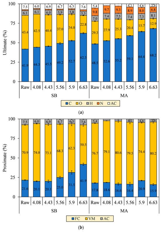 (a) Ultimate and (b) proximate composition of SB and MA biomasses and their hydrochars.