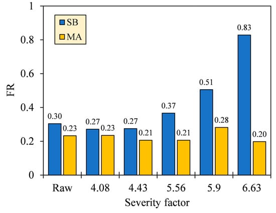The VM and FC are two aspects that govern the ease of ignition and flaming stability of fuels, which are commonly specified in terms of FR. As shown in Figure 9, the FR of SB hydrochar increased from 0.27 to 0.83 as the HTC severity increased, particularly starting from SFs 4.43 to 6.63. Meanwhile, the FR of MA was relatively constant before a notable increase was observed from SFs 5.56 to 5.90 (FR = 0.21–0.28), followed by a decrease at SF 6.63 (FR = 0.28–0.20). The smaller the FR, the easier the fuel burns, but the more unstable the combustion []. Reasonably, the high VM concentrations intensify devolatilization and gas oxidation, where the oxidation occurs locally in the gas mixing zone between VM and O2. Unfortunately, the presence of this zone results in an insufficient O2 concentration that is supposed to diffuse into the solids, thus limiting the FC oxidation [,]. The balanced condition for FR is accordingly proposed to range between 0.90 and 1.50 [], in which, with a slight increase in severity, only SB hydrochar complies with the condition. It is also worth noting that FR may not definitively signify the combustibility due to the different functional groups present in VM and FC. This is supported by a study by Zhang et al. [] reporting that oxygen-bearing groups (i.e., –OH/–COOH) exhibited higher spontaneity and reactivity than aliphatic and aromatic hydrocarbons (i.e., –CH3/–CH2–/C=C) during combustion.