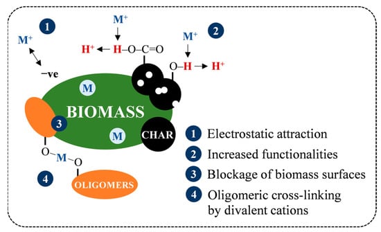 Following the drops in AC at SF 4.08 from 7.5% (SB) and 5.4% (MA) to 6.0% and 2.4%, the ashes of both hydrochars tended to increase to a maximum of 7.6% and 4.6%, respectively (see Figure 7b). The increase in AC is generally attributed to the amplification of the inorganic proportion to the intense VM degradation []. On the other hand, a previous study by Atallah et al. [] pointed out that the retention of metal elements on hydrochar during HTC can also contribute to the increase in AC, as depicted in Figure 10, due to (1) electrostatic attraction owing to temporarily induced dipoles, (2) growth of carboxyl and hydroxyl groups on the hydrochar surfaces, leading to metal readsorption by an increase in the cation exchange capacity, (3) blockage of the biomass surfaces by hydrolysis-derived products, reducing the extraction efficiency of low-soluble salts, and (4) co-reincorporation via oligomeric cross-linking, promoted by the divalent cations. This presence of ash may reduce heat release as a noncombustible portion to some extent [], and its alkali metal content potentially induces undesirable fouling and slagging, resulting in low combustor efficiency and economic losses [,]. However, the overall AC of SB and MA hydrochars not exceeding 8% means that both hydrochars meet the maximum permissible ash of less than 15% for renewable solid fuels and are equivalent to low-ash coal, with ash ranging from 5–15% [,]. Concisely, the AC trends imply that HTC can address the ash issue in energy conversion, and the early stage of hydrolysis (SF = 4.08) is preferable over the prolongation of HTC severity for maximum ash extraction.