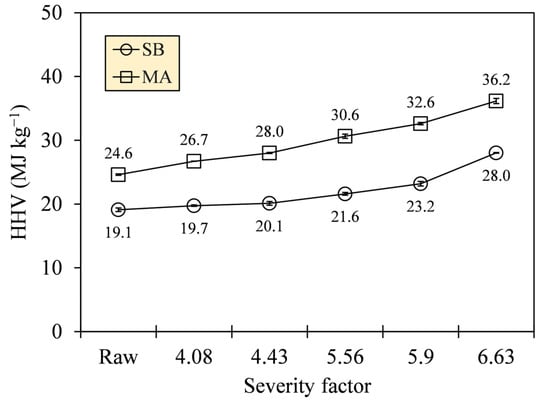 The improvement in carbonization quality was manifested in the increase in heat released by a unit mass of hydrochar produced. Figure 11 depicts an appreciable HHV generation with gross values reaching up to 28.0 (SB) and 36.2 MJ·kg−1 (MA) at the most severe HTC (SF = 6.63). These values indicate 46.7% and 46.9% increments relative to their raw states; interestingly, HTC did not alter the HHV deviations of the different biomass types.