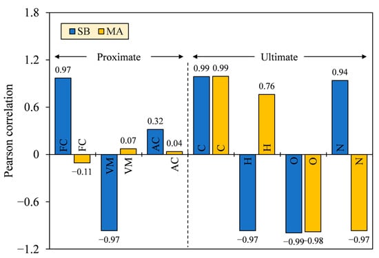 Observing the high correlation sizes and the same correlation directions for SB and MA, only C and O elements were identified to share common relationships to affect HHV in a positive and negative way, respectively. Therefore, a low oxidation state by reducing the O/C ratio is reasonably desired to produce hydrochars with higher heat release. The lower the oxidation state, the smaller the electronegativity of carbon-bonded atoms, and the higher the energy stored []. As a result, the HHV of MA biomass and its derived hydrochars was 5.5–9.4 MJ·kg−1 greater than that of SB in difference. The fluctuating correlation sizes and the nondirectional correlations of the proximate composition between SB and MA further clarify that HHV was not necessarily enhanced by high FC and low VM, as is a common notion, but rather, FC and VM possibly depended on the unexplained parameters, such as elemental constituents or chemical structures that compose them. In terms of chemical structures, the higher HHV can be partly attributed to the elongation and saturation of open-chain hydrocarbons, in contrast to the cyclization that has an implication on thermal stability [,]. The poor crystalline structures can also facilitate degradation upon combustion, improving heat release []. The presence of these structures is evident in our unpublished Py-GC/MS and XRD findings for SB and MA hydrochars []. Meanwhile, for AC, the adverse effects of the noncombustible portion did share common relationship with HHV, as indicated by the same correlation directions between SB and MA. However, the effect might be compensated by the high heat generation and low ash retention, making it less and positively correlated with HHV.