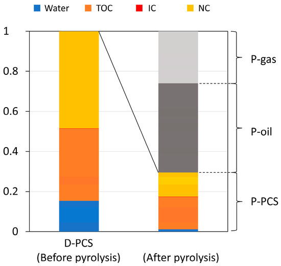 Composition of the PCS before and after pyrolysis and percentage of P-oil and P-gas with respect to the initial mass. Light and dark grey represent P-gas and P-oil, respectively. TOC: total organic carbon; IC: inorganic carbon; NC: non-carbonic matter; P-oil: pyrolysis oil; P-gas: pyrolysis gas.