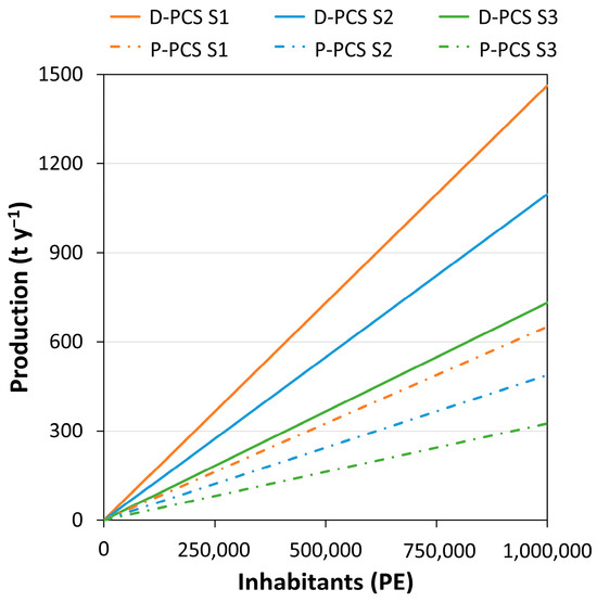 Production of D-PCS and P-PCS as a function of the inhabitants served in scenario 1 (S1), scenario 2 (S2), and scenario 3 (S3).