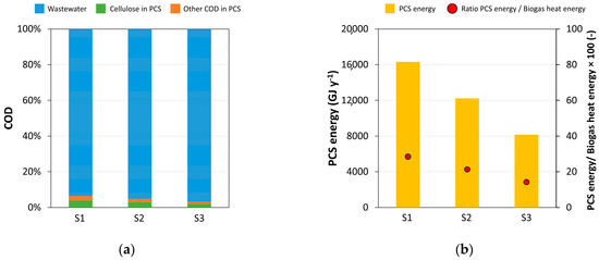 (a) Fluxes of the COD after mechanical separation of cellulose from wastewater in S1, S2, and S3. (b) Energy of the PCS in S1, S2, and S3 and ratio with the heat energy currently produced from biogas.