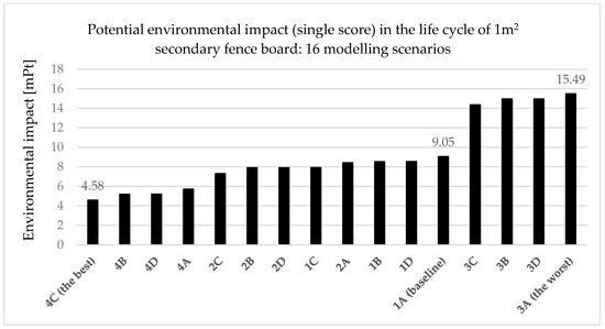 | Scenario 1D | Option 1 Recycling process I: recycling of 11.75 kg of packaging waste allocated to secondary board. Recycling at the cradle is debited with 10.625 kg of primary production of packaging materials. | Option D Recycling process II (recycling of 12.48 kg of waste secondary fence board allocated to secondary board). The secondary fencing is credited at EoL with −3.31 kg of primary market pot (mix) production. They have different durabilities; 12.375 kg of waste board for landfill; 0.125 kg of waste board for incineration; The secondary fencing is credited at EoL with −5.84 kg of primary market pot (mix) production. They have the same durability; 12.375 kg of waste board for landfill; 0.125 kg of waste board for incineration. |