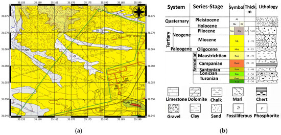 (a) The geological map of the Rotem Plain region, where the zone of the sand quarries is marked in green [53]; (b) the legend for the geological map.
