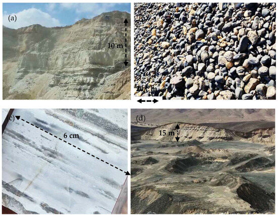Four photographs of the chert rocks. (a) A typical view of a sand quarry slope with noticeable layers of chert gravel; (b) chert gravel of different sizes from 5 to 20 cm; (c) a typical stripped texture of chert gravel; (d) the photograph of the landfill of the sand quarries covered with vast reserves of chert gravel.