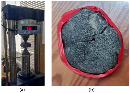 Point load tests comprehensively described in [55] were carried out to estimate the corresponding index strength of the samples with uneven shapes. The observations were conducted using the MATEST instrument (Figure 4a). The point load strength index ‘Is’ is generally used for the strength characterization of samples with irregular shapes (Figure 4b). It was calculated according to [56] as follows: