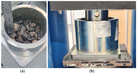The crushing test. (a) The samples of chert gravel inside the crushing cylinder; (b) the photograph of the assemblage of the crushing test.