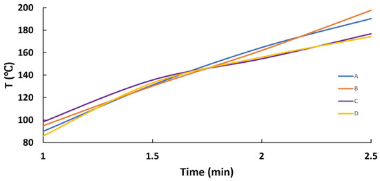 The temperature values at the surface of the sample under study at the end of microwave irradiation (see Section 2.1 for the “A–D” descriptions).