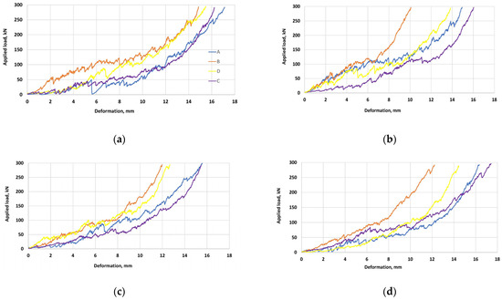 Figure 7 shows typical load–deformation curves of gravel under the standard crushing condition. All curves are characterized by two main parts: a. the applied load is 0–150 kN; b. the applied load ranges from 150 to 300 kN. Stage “a” is characterized by load drops and a low slope of curves, while the curves at stage “b” are smoother than at stage “a”, and their slope is higher. Our preliminary study showed that 150 kN is the load needed for course gravel crushing, beyond which there are no unfractured coarse gravel pieces within the loading steel cylinder (Section 2.3). Moreover, this load range corresponds to the values of gravel strength observed in our previous study by the uniaxial compression and Schmidt hammer methods [54]. Our analysis showed that an increase in load above 150 kN causes a decrease in gravel size and increases the percentage of the sand fraction (0.075–4.75 mm).