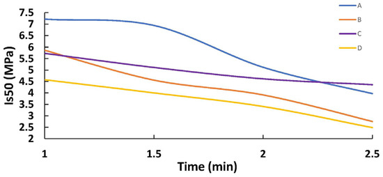 The values of the point load index after irradiation tests for A–D type samples (Section 2.1). Subscript 50 means that the results were normalized for the samples’ diameter 50 mm.