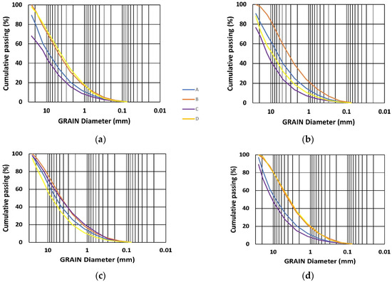 Typical grain distribution curves of gravel after the crushing tests. (a–d) show the curves for 1, 1.5, 2, and 2.5 min of gravel irradiation, respectively. The blue and orange curves display the results for samples with a dry surface at the beginning of the test (A and B in Section 2.1, respectively). The purple and yellow curves are the measurement results of samples with a “wet surface” at the beginning of irradiation (C and D in Section 2.1, respectively). The orange and yellow curves show results for samples to which the quenching procedure was applied.