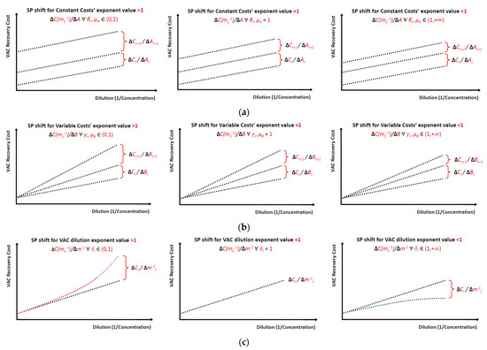 Equation (1) suggests that for every VACi that is recovered by an industry j, the cost of recovery Ci comprises a function of the VAC’s dilution in terms of inverse mass concentration 1/mi. Parameter ai concerns constant costs (costs that are paid by the industry irrespective of the VAC’s recovery volume), and parameter bi concerns variable costs (costs that are proportional to the VAC’s dilution level), with βi, γi, and δi being their respective exponents. An SP can theoretically take any nonlinear (monotonic or not) or linear form [4]; however, linear regression models are empirically the most prevalent models and most operationally convenient to use. A complete mathematical analysis of the SP’s elements, derivation, behavior, and market structure can be found in [4]. The three rows of Figure 1 (below) schematically depict the effect of the values of exponents β,γ, and δ on the general behavior of a standard SP according to Equation (1).