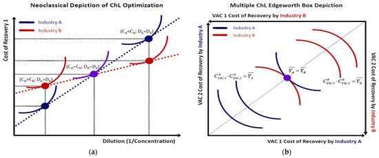 In this section, we develop the microeconomic foundations of VAC recovery optimization in line with neoclassical microeconomic theory [9], assuming the standard linear SP model unless stated otherwise. Specifically, we present the necessary conditions for allocating a VAC’s recovery between two or more industries, establishing the potential for structuring a ChL contract. The microeconomic potential for synergistic VAC recovery is depicted through an Edgeworth Box that incorporates each industry’s isotechnical curves that emerge from any initial dilution–cost coordinate. In its general form, an isotechnical depicts all combinations of a VAC’s dilution mi−1) by an industry j and its cost of recovery (Cij) at which the average cost C (capped) remains constant as: