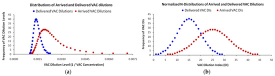 In Figure 5a, we present the distortion of a perfectly symmetrical Normal distribution giving a false visual impression of a positively skewed Normal distribution or even a Log–Normal distribution. Specifically, we present two simulated samples of 500 VAC dilution observations each. The first distribution (red) is the distribution of VAC dilution level frequencies at their arrival to the IS cluster for further processing, while the second distribution (blue) is the distribution of VAC dilution frequencies at their delivery to the customer by the IS cluster, after processing and recovering them from wastewater. Both distributions are described by the SP formula 1/Concentration (1/m, with m expressed as mg/L). Keeping that scale will create a visual distortion suggesting that the distributions are asymmetrical. By normalizing the data by simply assigning to each dilution level a monotonically increasing VAC Dilution Index (VAC DI) (e.g., for dilution 1/mi1 = 0.001→DI = 1; 1//mi2 = 0.001020→DI = 2, etc.), the data are visually corrected back to resemble the properties of the true distribution. Following this framework, Figure 6 depicts the frequency of VAC DI arrivals of N = 500 simulated samples, as presented in Figure 5b.