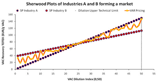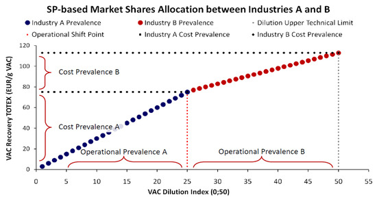As ChL contracts are financial mechanisms for optimally allocating the recovery of VACs from wastewater in an IS market, we further consider Industry A and Industry B as its elements. We have already assumed a difference in their parameters, with aiA < aiB and biA > biB, according to Equation (1). For simplicity, we also assume the standard linear SP model with αij = βij = γij = δij = 1 for both industries. In addition, we assume that both industries have a common technical limit and operational range, meaning that there is an upper VAC dilution level after which none of the industries can technically achieve its recovery [4]. Hence, both industries can operate (to recover the VAC) in the range between that technical limit and 100% VAC concentration, meaning that both industries have exactly the same technological capabilities [4]. However, we can expect that for specific segments of this common operational range, industries are unequal in efficiency. For linear SPs, across an ascending or descending sorting of the VAC DI, the point after which the cost-efficient VAC recovery is achieved by a different industry than before is the operational shift point [4]; as, before or after that point, another industry begins to cost-dominate the VAC’s recovery [4]. However, irrespective of the above assumptions, the total number of operational shifts is relative, depending on the number of industries operating in the VAC DI range [4]. For simplicity, here, we assume that the market consists of only two industries. Figure 7 depicts how a market’s SP is composed by two individual industry SPs [4].