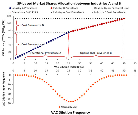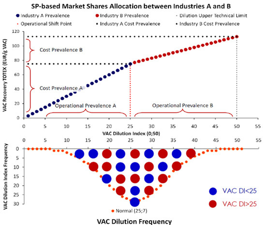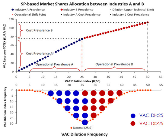 In Figure 7, as each industry is more cost-efficient at specific domains of the VAC DI range, the market will allocate industry shares by cost-prevalence. This domain is defined by where the VAC’s recovery is achieved at the minimum cost [4]. In our example, Industry A dominates in a range of lower VAC DI values (DI∈[0,25)), while Industry B dominates in the domain of higher VAC DI values (DI∈(25,50]). The SPs of the two industries intersect at VAC DI = 25, at the only dilution level where both industries recover the VAC at the same cost. This is the operational shift signaling the VAC’s cost-optimal recovery transition from Industry A to B. The nine assumptions regarding the VAC’s recovery and the relation between customers and industries are presented in Table 1.