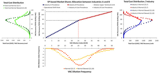 A significant dimension of Figure 10 concerns the share that each industry has in the total cost. Although, in the case of the symmetric Normal distribution, 50% of the arrivals contain the VAC in dilution below DI = 25 and 50% above it, the recovery cost of Industry B for each DI > 25 is higher so that its share in the total cost of the market is higher, even if its Cost-Prevalence Index (CPI) [4] is lower.