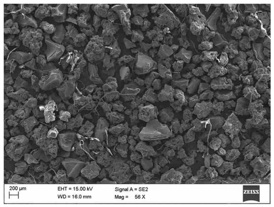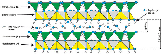 Halloysite (Figure 1) (HAL) is an aluminosilicate clay from the kaolinite subgroup. As a mineral used in the research, it was derived from the Polish Lower Silesia Dunino Deposit. This geological deposit is characterized by a specific structure and chemical composition, resulting in unique properties. Micro- and nano-structural SEM analysis revealed that the halloysite samples consisted of mixed nanotubes (HNTs) [50] and nanoplatelets (HNPs). Elemental chemical analyses were conducted for 5 dried raw samples, and the averaged concentrations of the major elements (energy-dispersive X-ray spectroscopy (EDS)) analysis (as mass %) were: O (43.39%), Si (19.51%), Al (18.71%), Fe (12.92%), and Ti (1.42%) [51]. The X-ray diffraction of this material revealed the following minerals: halloysite, kaolinite, hematite, magnetite, quartz, magnesioferrite, rutile, ilmenite, geikielite, goyazite, gorceixite, and crandallite.