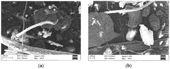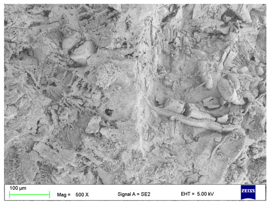 Structure of hybrid soil modifier after the tests—hydrated, dried, and hygienized R-SPA mixed with cellulose fibers from AHP and HAL (SEM).