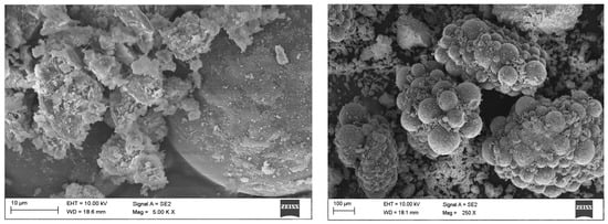 Examples of SEM images of SPA particles with halloysite grains introduced on their surface are shown in Figure 5, whereas Figure 6 shows a SPA particle present in the soil environment.