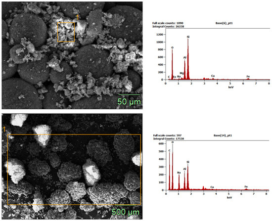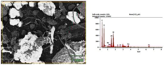 The SEM/EDS analysis of SPA particles with surface-deposited halloysite adsorbent, directly in the tested soil environment, is shown in Figure 7.