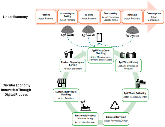 Converting agricultural waste into valuable resources has enormous potential to improve sustainability and resource efficiency. Thailand’s agricultural sector confronts considerable obstacles in shifting from a linear to a circular economy, particularly in waste valorization and the digital transformation of agri-food supply chains. Significant systemic adjustments in farming and retailing are required for a transition from the traditional linear paradigm of creating, consuming, and discarding to a circular economy that stresses recycling, reuse, and waste reduction (see Figure 1). The linear economy model encompasses a series of interconnected nodes, beginning with farming and followed by harvesting, packaging, distribution, and finally, retailing. This model has two primary stakeholders: farmers and retailers. The majority of waste is produced throughout the stages of harvesting, packaging, and retailing. In the circular economy model, farmers and retailers require significant adjustments to their routines to valorize food and agricultural wastes. Through digital technology for waste trading, sellers (farmers and retailers) and customers (value-added material manufacturers) can conduct their transactions online. Next, the recycle center intermediary travels to pick up agricultural wastes from farmers and retailers, transforms those wastes into value-added materials, such as bio-based leather and paper, and delivers those materials to the necessary manufacturer to produce the final products.