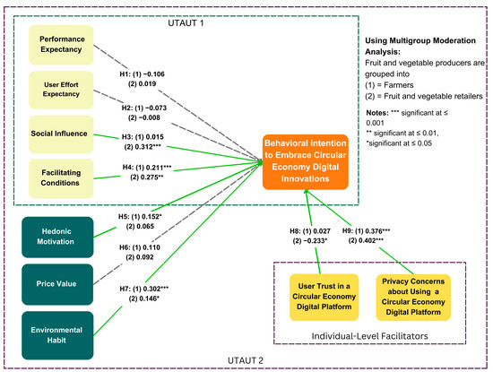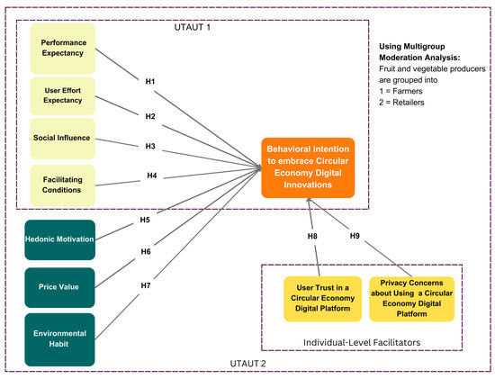 The objective of this research is to fully comprehend the actions of real users (fruit and vegetable retailers vs. farmers) by analyzing and classifying their interactions with the agricultural waste platform. We intend to investigate the following research questions (RQs). RQ1: What factors affect users’ behavioral intention to use an agriculture waste trading platform that promotes a circular economy? RQ2: How are the behaviors of farmers and retailers differentiated regarding the intention to use an agriculture waste trading platform that supports a circular economy? Therefore, this study investigates the factors derived from the extended theory of UTAUT2 (performance expectation, effort expectancy, social influence, facilitating conditions, hedonic motivation, price value, and habit) [9] and two additional variables (trust and privacy) [8]. The study uses structural equation modeling (SEM) to analyze the causal relationship between the variables in the model. Explicitly, this study developed a predictive model to identify the factors influencing farmers’ and retailers’ behavioral intentions to use a digital platform for trading agricultural waste. Therefore, structural equation modeling (SEM) is a statistical technique suitable for analyzing the relationship between multiple variables [10,11]. Multigroup structural equation modeling analysis is appropriate for this study since it allows for a deeper assessment of farmer and retailer behaviors, revealing insight into the unique elements that influence their intention to utilize the circular economy digital technology. This research will provide vital insights into the creation of successful digital platforms and agricultural waste management solutions for Thailand’s transition to a circular economy.