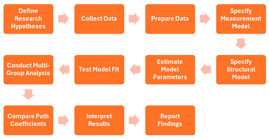 In this study, the data were analyzed using the structural equation modeling (SEM) technique with the AMOS statistics program. SEM employs statistical methods such as path analysis, confirmatory factor analysis (CFA), causal modeling with latent variables, analysis of variance, and multiple linear regression [90]. Structural equation modeling (SEM) was used to evaluate the model in three steps. At first, it involves conducting a CFA (confirmatory factor analysis) to establish the factor structures of the measurement models and assess data reliability and validity, including convergent and discriminant validity as well as goodness of fit. Next, structural equation modeling (SEM) is used to examine the goodness of fit of the structural model and evaluate the structural relationship between independent and dependent variables. In the last step of the SEM process, multigroup analysis (MGA) is utilized to examine the impact of differences in experiences between the two sample groups on the structural relationships proposed by the hypotheses. This step involves measuring invariances across sample groups to determine the extent to which dimensional characteristics of the data are consistent across different conditions [91,92]. The user’s occupation serves as a moderating factor for differences between groups.