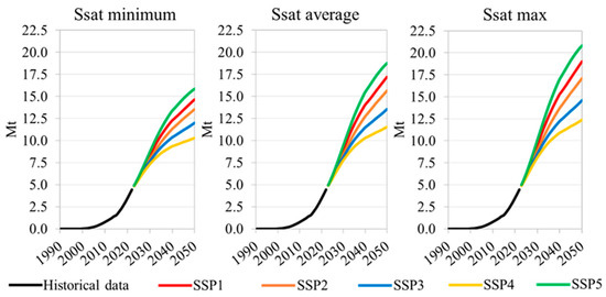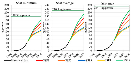 The survival ratio (SR(t)) and discard ratio (DR(t)) are Weibull functions with an average mean lifetime of 21.9 years calculated from [39], as detailed in Table S4. In addition, three scenarios of stock saturation (minimum, average, and maximum values) were considered based on developed countries’ estimates: 178.3 kg/cap, 210.9 kg/cap, and 234.1 kg/cap, respectively. These values, as well as the parameters for logistic curve function, are shown in Table S5.