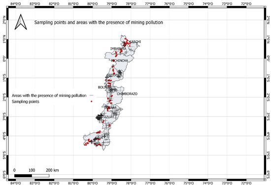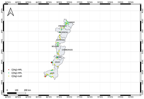 In any case, it appears that the most affected provinces are those located in the south of the region: Loja and Azuay. The network of sampling points is not uniformly distributed over the territory but was determined according to a “reasoned location”. In other words, based on the information collected, sampling sites were selected in the areas closest to mining activities. At mining locations, especially ASGM, other potentially toxic substances are used in addition to Hg, such as arsenic (As), cadmium (Cd), chromium (Cr), copper (Cu), nickel (Ni), lead (Pb), tin (Sn) and aluminum (Al). It should be considered that multiple toxic substances in combination can dramatically exacerbate potentially hazardous conditions, and additionally, as mining activities continue to increase, Hg (and also of any other toxic substances) concentrations could continue to rise over time, resulting in a higher risk status for populations in these areas.