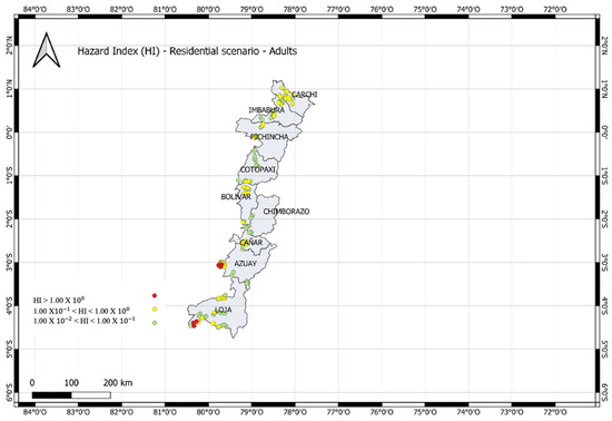 Taking into account the philosophical doctrine of determinism, the impacts on human welfare are cataloged in Figure 3, Figure 4, Figure 5 and Figure 6 by means of a punctual damage map. The numerical data of HI by sector (Table 3) are presented below: Loja > Azuay > Bolivar > Imbabura > Cotopaxi > Pichincha > Cañar > Chimborazo > Carchi. The risk analysis performed using the traditional deterministic approach showed a risk of 7.43% for the adult population in the residential scenario and 10.86% in the recreational scenario. Meanwhile, for the child population, a risk of 18.29% and 17.71% respectively emerged according to the above scenarios. The risk analysis makes it possible to estimate the risk associated with different receptors, according to their vulnerability. The latter is influenced, among other factors, by age. In risk analysis, unless specific data are provided, all individuals aged 0–6 years are considered ‘children’. In a more detailed risk analysis, surveys are carried out to allow more accurate quantification of the type of targets present in the survey area. Therefore, the results of the analysis suggest a higher vulnerability in both scenarios for the child population, which is more exposed. Finally, thanks to the results obtained from the residential context, the main route of exposure was found to be ingestion. On the other hand, the following result demonstrates that the highest risk mode of exposure is dermal contact.