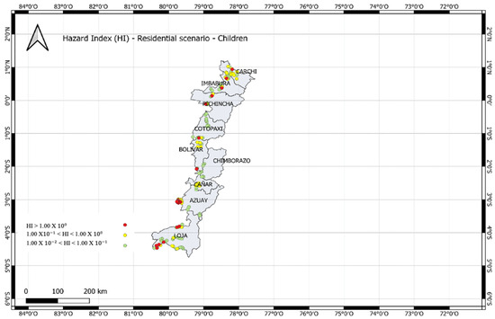 The figure provides a detailed overview of the Hazard quotient (HQ) for children in residential areas. It highlights that the provinces of Azuay and Loja show the most significant levels of risk. This crucial analysis provides a clear understanding of the areas where children may face the greatest dangers in their residential environment. The evidence underscores the need for targeted interventions in these regions to ensure the safety and well-being of the very young.