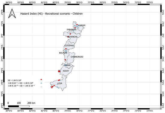 Analysis of the Danger Index (Hq) in recreational settings for children reveals areas of concern, particularly in the provinces of Carchi, Pichincha, Cotopaxi, Bolivar, Azuay, and Loja. These results highlight the urgency of addressing the specific risks faced by children in these recreational settings. It is crucial to implement preventive measures and effective safety policies to ensure their protection during their recreational activities.