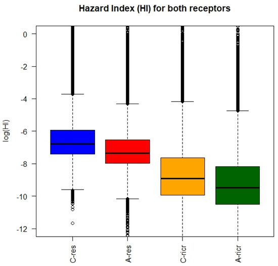 Boxplots of the hazard index (HI) for both receptors. The prefixes C and A refer to children and adult receptors respectively, while the suffixes -res and -ricr refer to the residential and recreational scenarios.