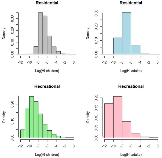 The main activities that can bring receptors into contact with the contaminant, in a residential-type scenario, are therefore the accidental ingestion of contaminated water [15] and also the consumption of some particular fish species. The recreational scenario identifies all those spaces intended for playful activities such as hunting, fishing, sports, etc. These are activities that can, in general, be considered occasional. Therefore, the human receptors present in these environments, which may be either adults or children, are exposed to contamination for limited intervals of time. All these activities involve contact with the environment, so one of the most significant modes of exposure is dermal contact. However, the recreational scenario encompasses a wide range of different activities, so a more specific analysis could detect, with reference to some of these activities, a higher and more frequent exposure of the child population. Finally, it should be noted that with reference to work contexts in which Hg amalgam processes take place, the most frequent route of exposure is inhalation of Hg vapors [13,14].