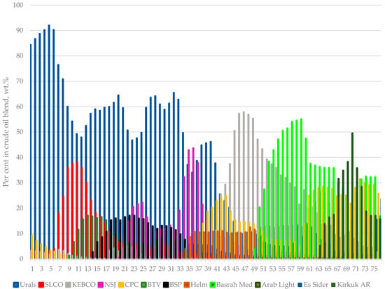 Variation of individual crude oil content in the petroleum mixtures processed in the LNB refinery for the studied period of time of 76 days.